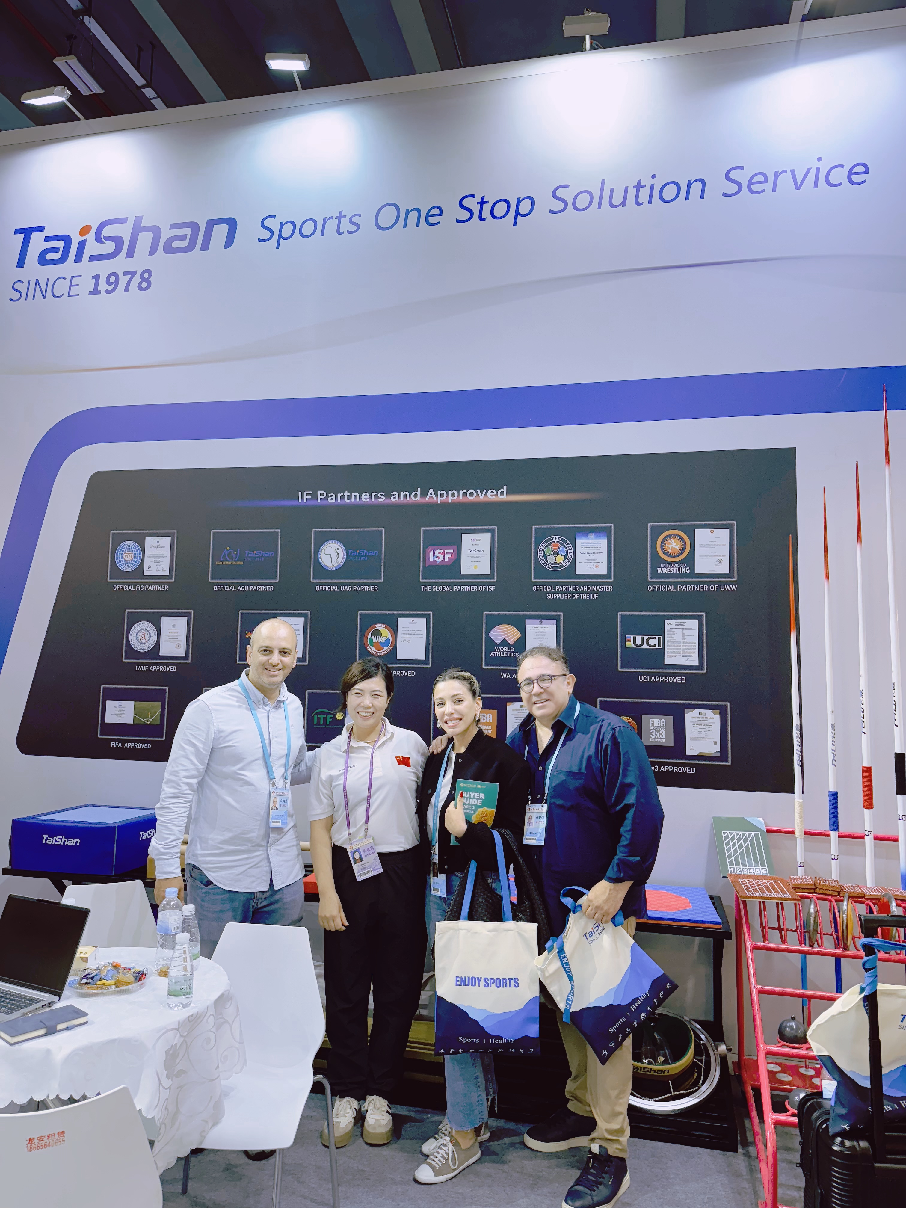 jn江南体育提供的竞技体育器材产品种类齐全、质感细腻、质量优良,碳纤维跳马、摔跤垫、新型武术场地、空手道垫、跆拳道拼接垫、拳击护头(手套)、柔道服等20余种体育器材产品,吸引了众多观展商的目光,收到了良好的参展效果。