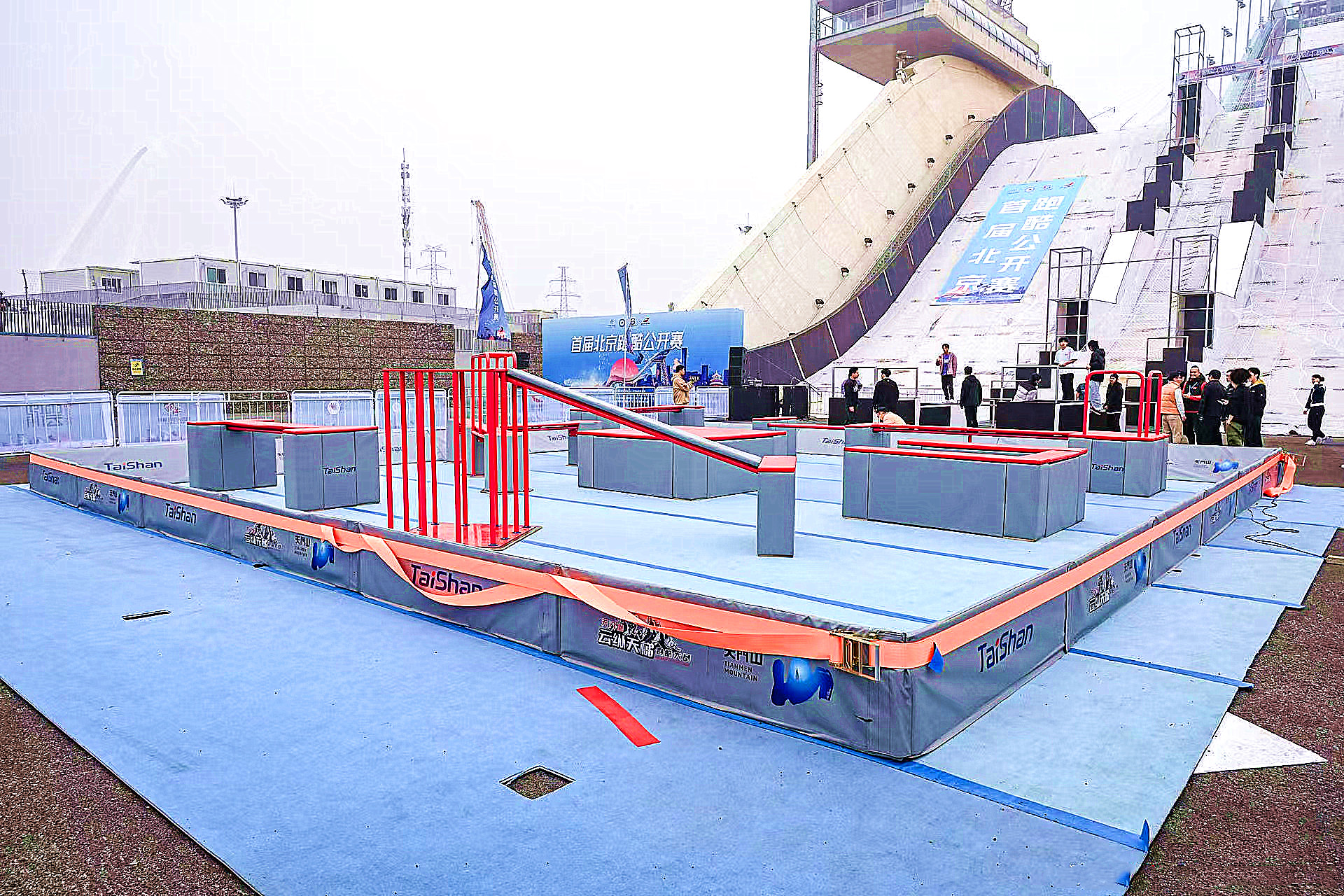 比赛以大跳台及其落地区域为赛场,搭建形成多组颜色鲜艳、各具特点的跑酷赛场。其中大跳台跑酷竞速赛道最为亮眼,赛道在大跳台本体上搭建而成,由大跳箱、滑梯、单杠、速降杆等大型专业跑酷道具组成,为目前全球最陡上升赛道,这对jn江南体育安装团队和跑酷器材场地适用性,又是一次严苛检验。